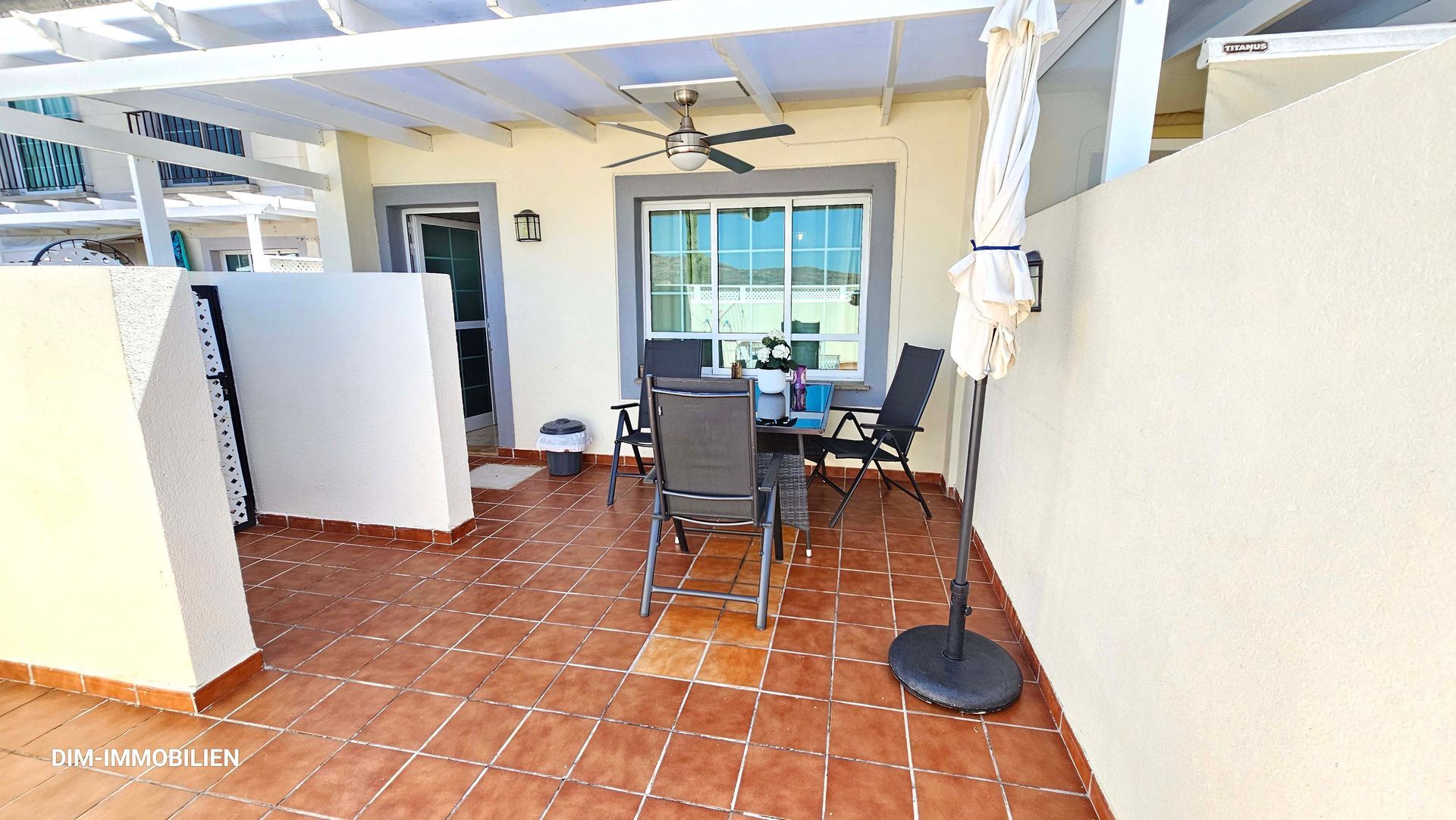 Überdachter Sitzbereich mit gemütlichen Möblen & Deckenventilator
